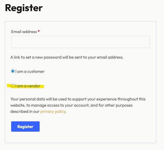 Click the “Register” button to go ahead and setup an account on our platform. If you are a seller, you should choose the “I am a vendor” option. Then follow all of the steps in the registration process. It is a very quick sign up process.