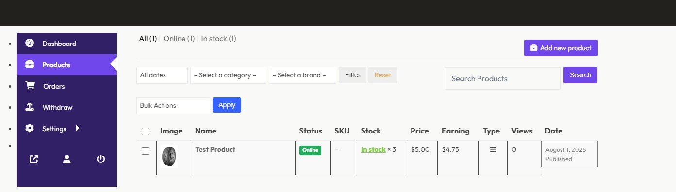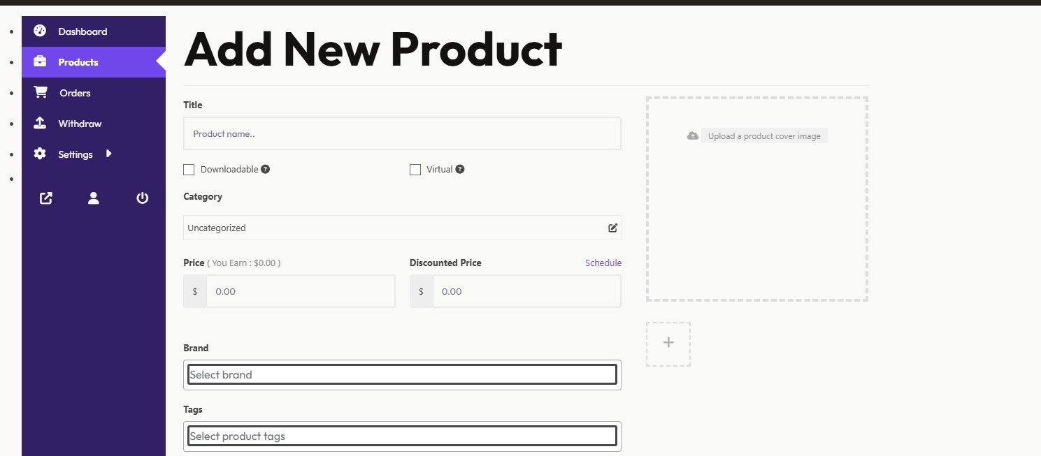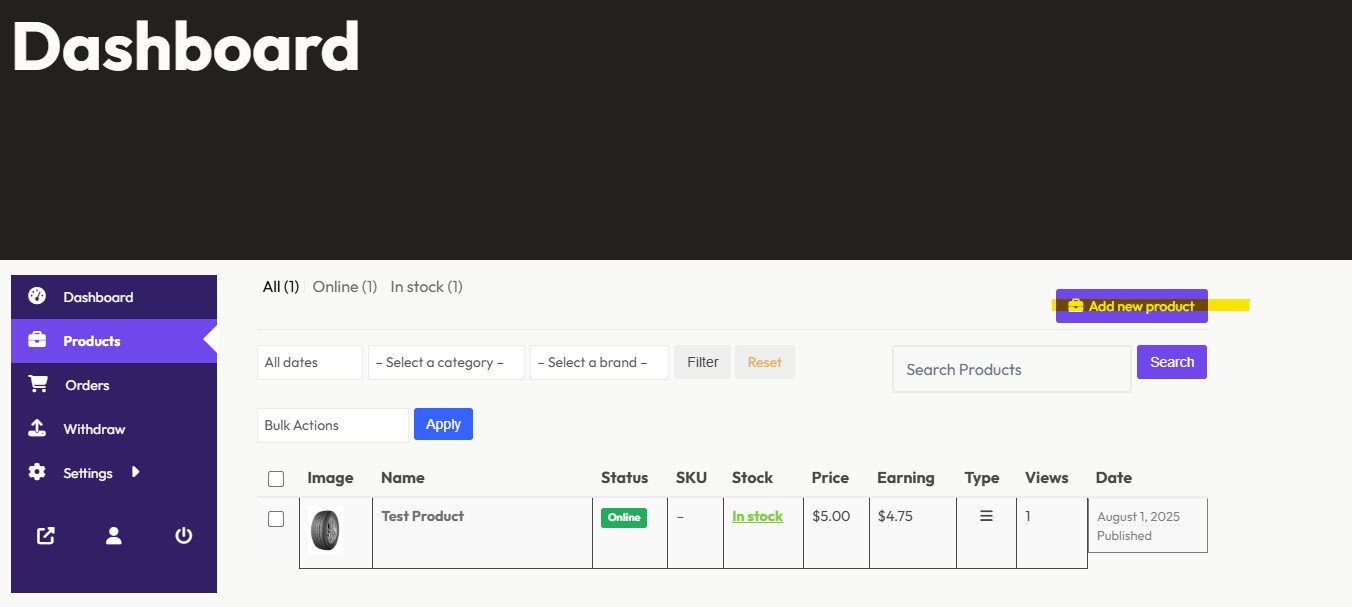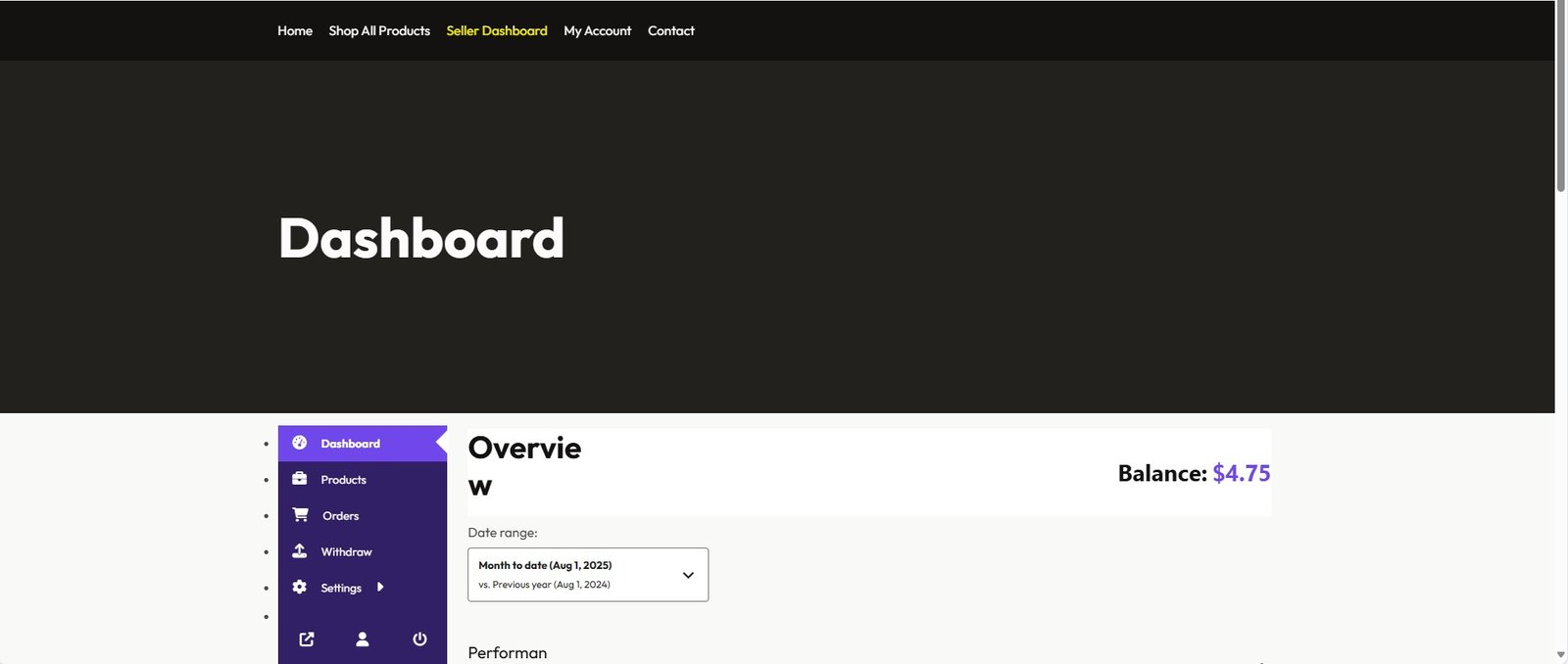 After you finish registering you will land at the Seller Dashboard. This is the place where you will create products, manage your orders, and get paid!