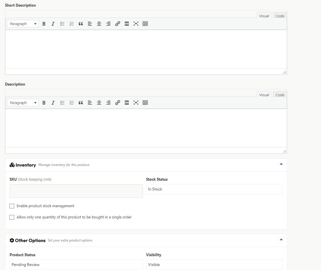 For “Inventory” you can choose “Enable product stock management” if you have more than 1 quantity of the product or service available in Inventory. This will make it so if someone purchases less than your stock of inventory the product will continue to be available. You can also select “Allow only one quantity of this product to be bought in a single order” if you only want someone to be able to purchase 1 quantity of the product at a time. The “Stock Status” can also be changed as needed.