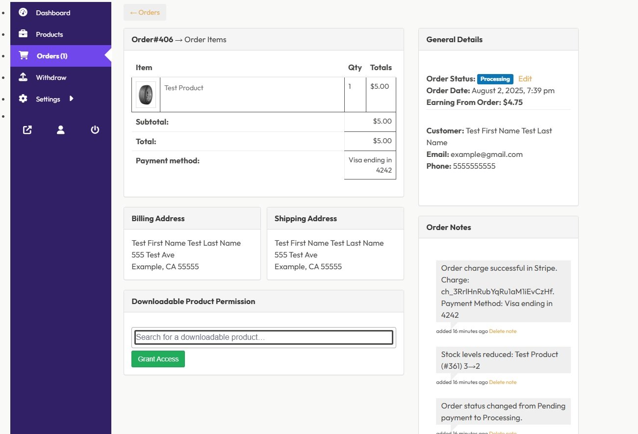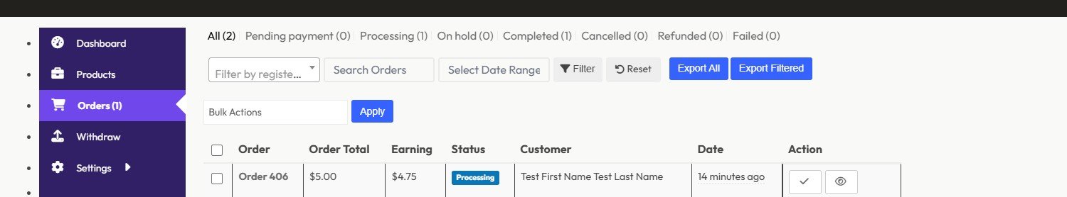 If a customer orders your product you will see an order show up in the “Orders” menu and it will be in a “Processing” state.